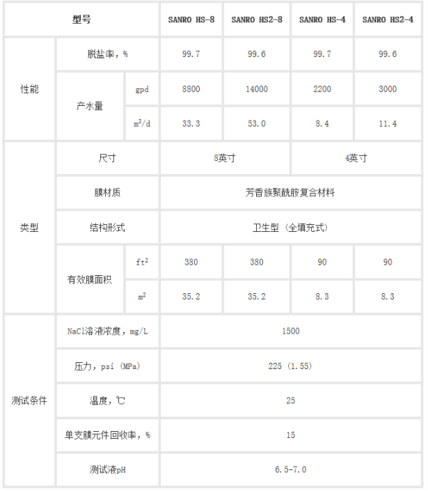 通過嚴格地生產和質量監控手段充分地保證了每 一支膜元件都具有優良超群的性能特點。SanRO-HS系列產品已通過了美國食品與藥品管理局(FDA)認證,使其在醫藥純水及其它高純水系統中得到了普遍應用。