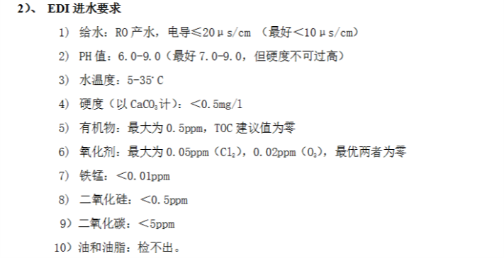 1、活性炭吸附水中的余氯,余氯是強氧化性物質,對后級系統的反滲透膜和EDI均有強氧化作用,氧化后,反滲透膜和EDI膜塊性能將不能恢復。詳見下表反滲透膜和EDI模塊進水要求: